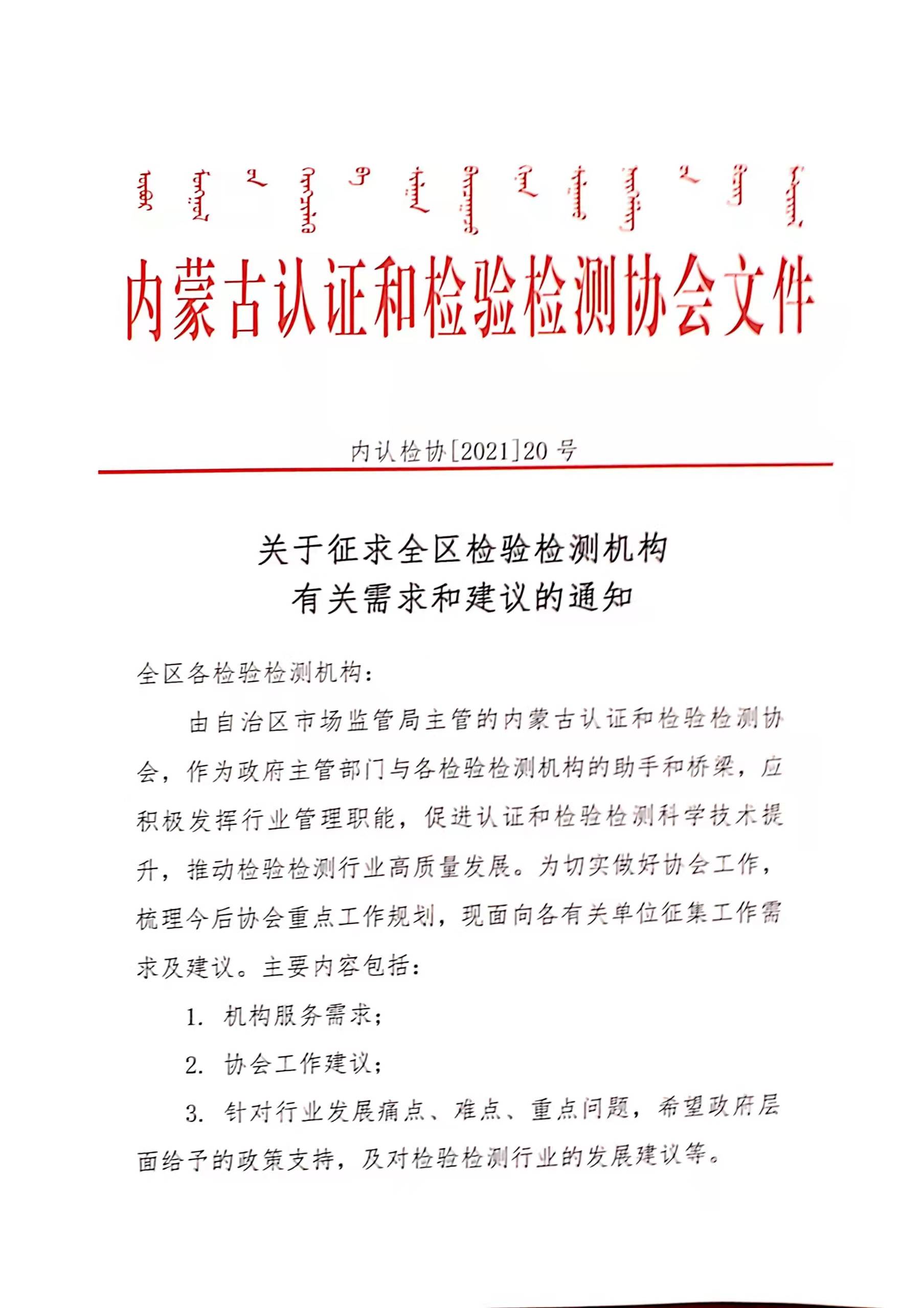 内蒙古认证和检验检测协会服务需求及建议征集表