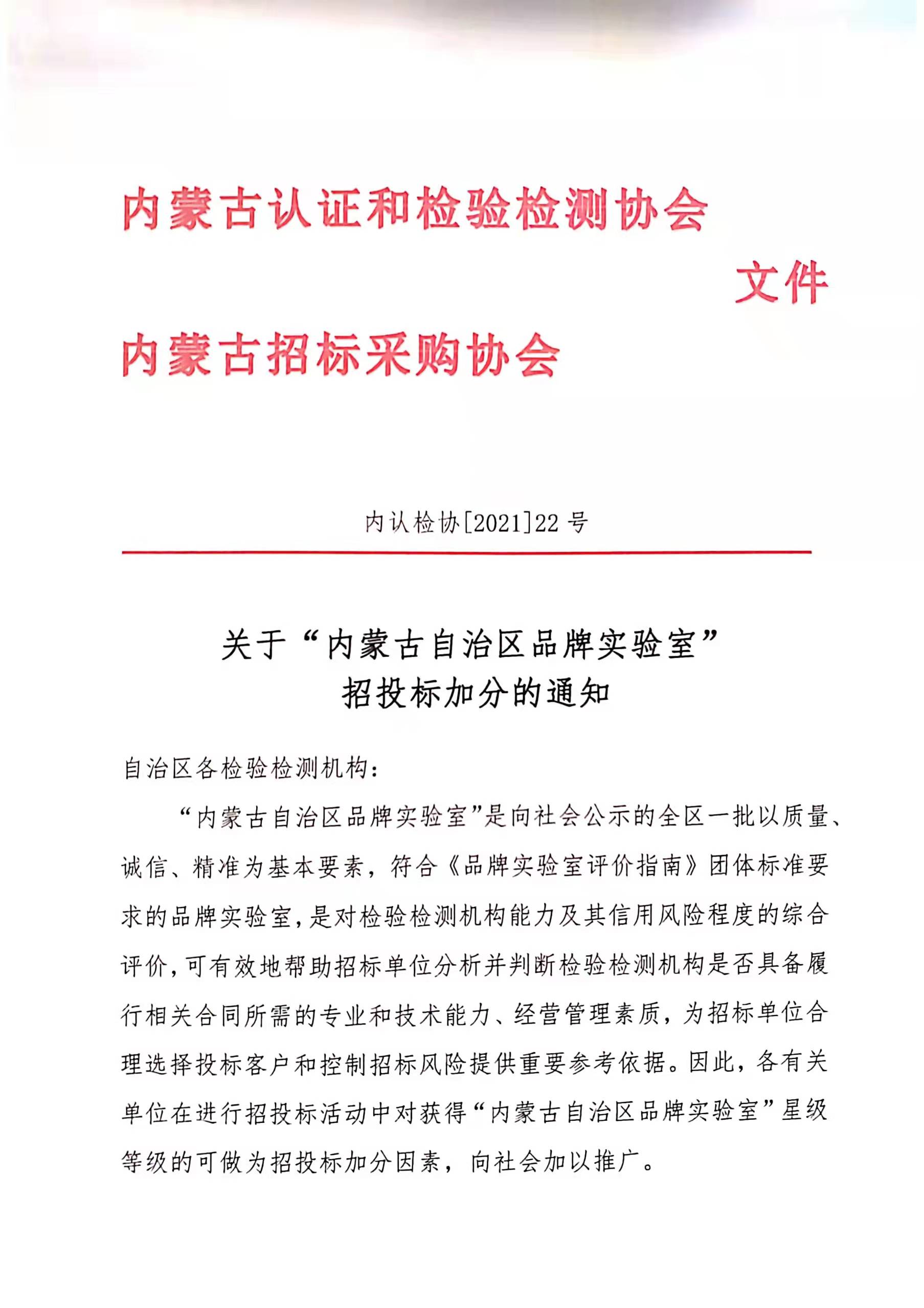 关于“内蒙古自治区品牌实验室”招投标加分的通知