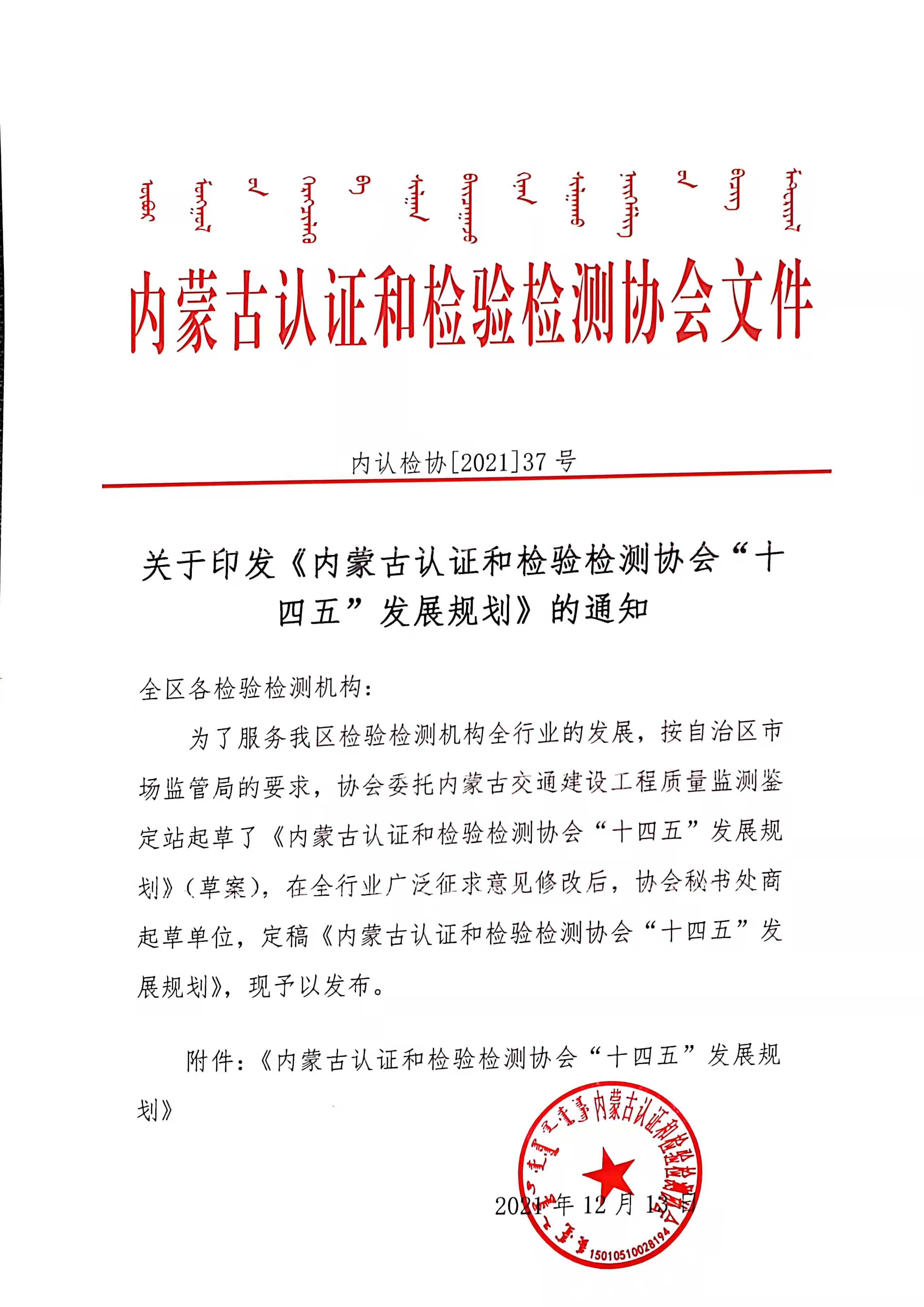 关于印发内蒙古认证和检验检测协会十四五发展规划的通知