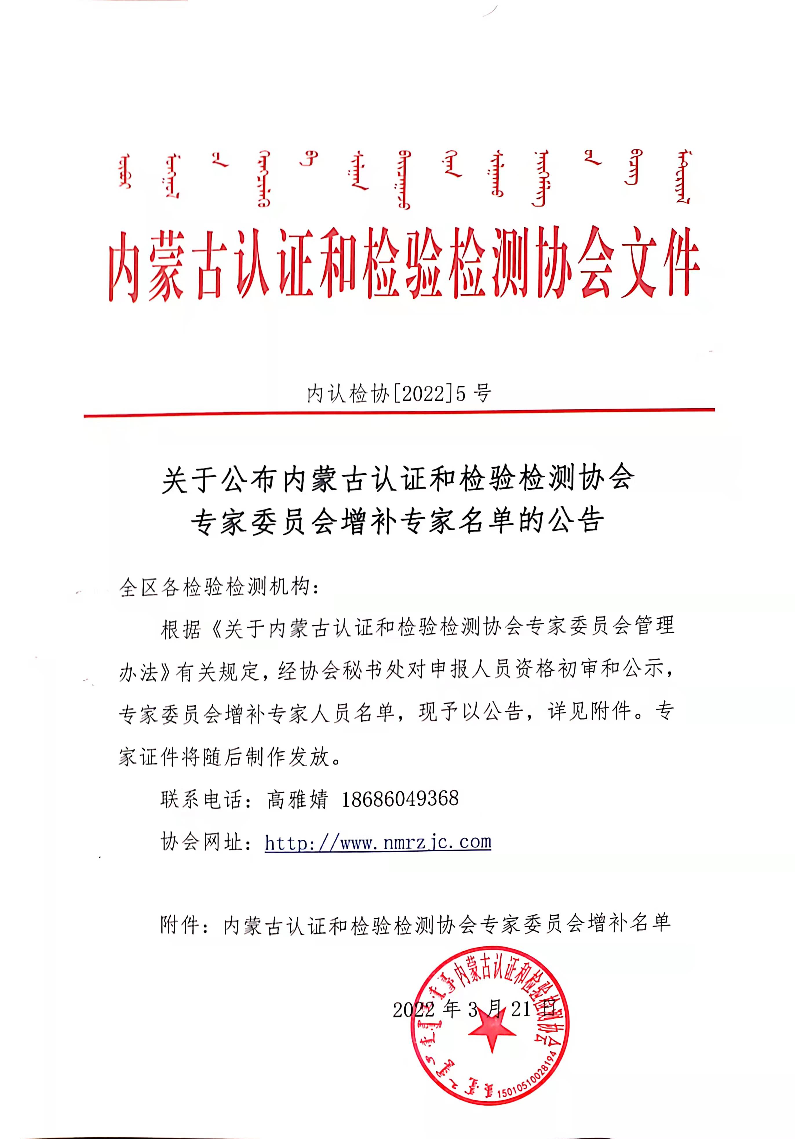 关于公布内蒙古认证和检验检测协会专家委员会增补专家名单的公告