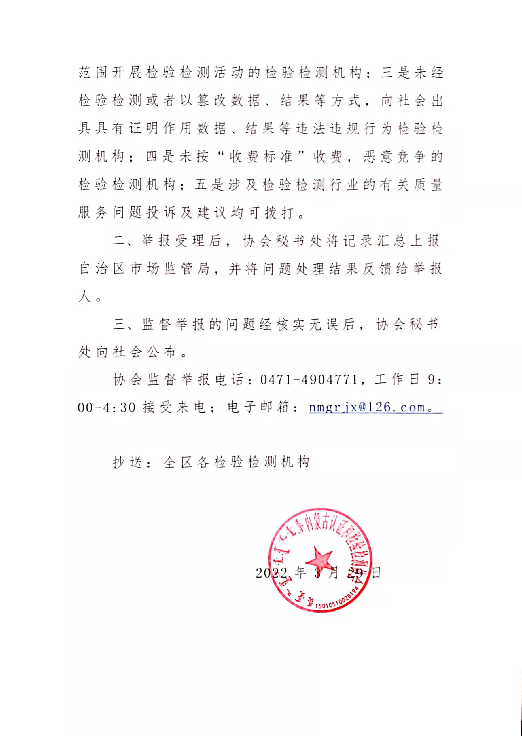 关于公布检验检测行业质量监督举报电话的通告