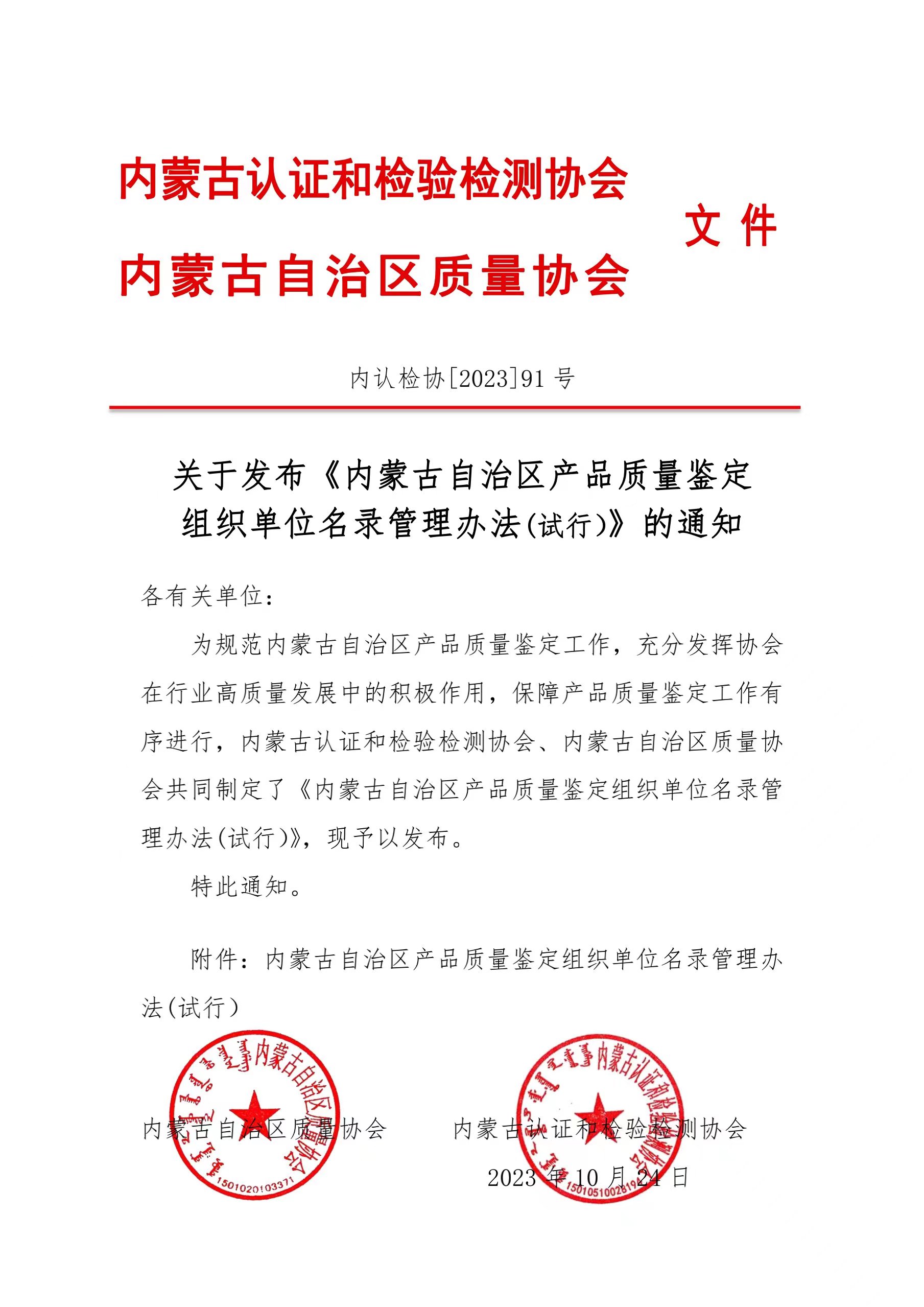 为规范内蒙古自治区产品质量鉴定工作,充分发挥协会在行业高质量发展中的积极作用,保障产品质量鉴定工作有序进行,内蒙古认证和检验检测协会、内蒙古自治区质量协会共同制定了《内蒙古自治区产品质量鉴定组织单位名录管理办法(试行)》,现予以发布。
