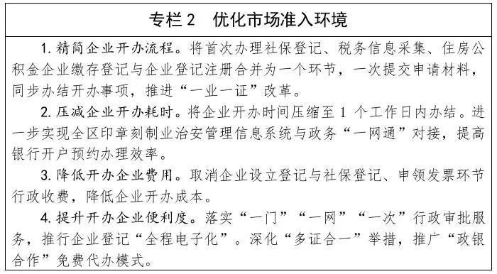 ——激发主体活力,宽松便捷的市场准入环境进一步优化。建立健全与市场准入负面清单制度相适应的准入机制。市场监管行政审批事项进一步压减。市场活力持续激发,构建有利于大众创业、万众创新蓬勃发展的政策环境、制度环境。企业开办时间缩减,新增市场主体持续增长、活跃发展,新设企业生命周期延长。