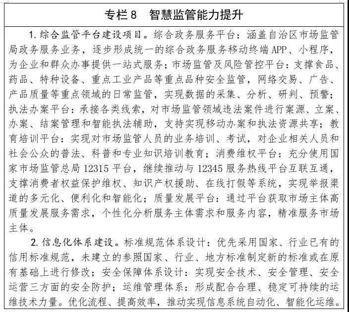 加强智慧监管。建设全区统一的市场监管信息化体系,实现各类监管数据集中管理,形成“大平台支撑、大数据慧治、大系统整合、大服务惠民、大监管共治”的市场监管信息化发展新格局。加快推进“1613”重点任务,即建设“一个大数据中心”(内蒙古市场监管大数据中心);“六大业务平台”(“一网通办”综合政务服务平台、市场监管及风险管控平台、执法办案平台、教育培训平台、消费维权平台、质量服务平台);“一个基础设施支撑”(包括网络资源、计算存储资源、备份资源等基础环境资源在内的保障有力的一体化基础设施);“三大保障体系”(完善信息化标准规范体系、加强安全保障体系、强化运行维护体系)。加快推进涵盖“小个专”党建在内的智慧党建平台建设。