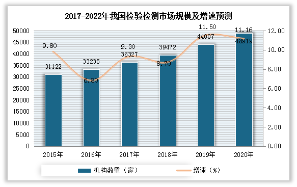 与市场规模走势相同,近年来我国检验检测机构数量也呈现不断增长态势。数据显示,截至2020年,我国共有检验检测机构48919家,较上一年增长11.16%。