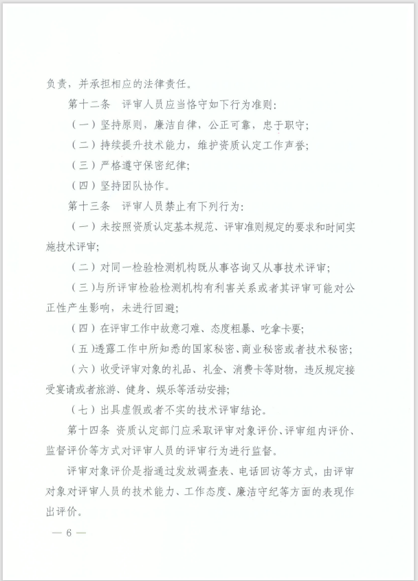 《办法》依照《检验检测机构资质认定管理办法》(2021年修订版)相关内容,明确了评审员、主任评审员、技术专家的条件和相应职责,细化了评审人员培训、考核、使用和监督制度。各省级资质认定部门可以在《办法》的基础上,细化相关要求和工作流程,确保各项管理制度落实到位。