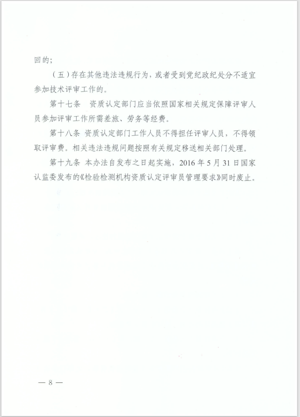 检验检测机构资质认定(以下简称资质认定)技术评审是资质认定行政许可的重要环节,资质认定评审人员对资质认定技术评审结论起到关键作用。为持续推动资质认定制度“放管服”改革,进一步规范管理、优化服务、强化监督,不断提高技术评审工作的有效性和规范性,在2016年国家认监委发布的《检验检测机构资质认定评审员管理要求》基础上,修订形成了《检验检测机构资质认定评审人员管理办法(试行)》(以下简称《办法》)。现将《办法》印发你们,并就加强评审人员管理要求如下: