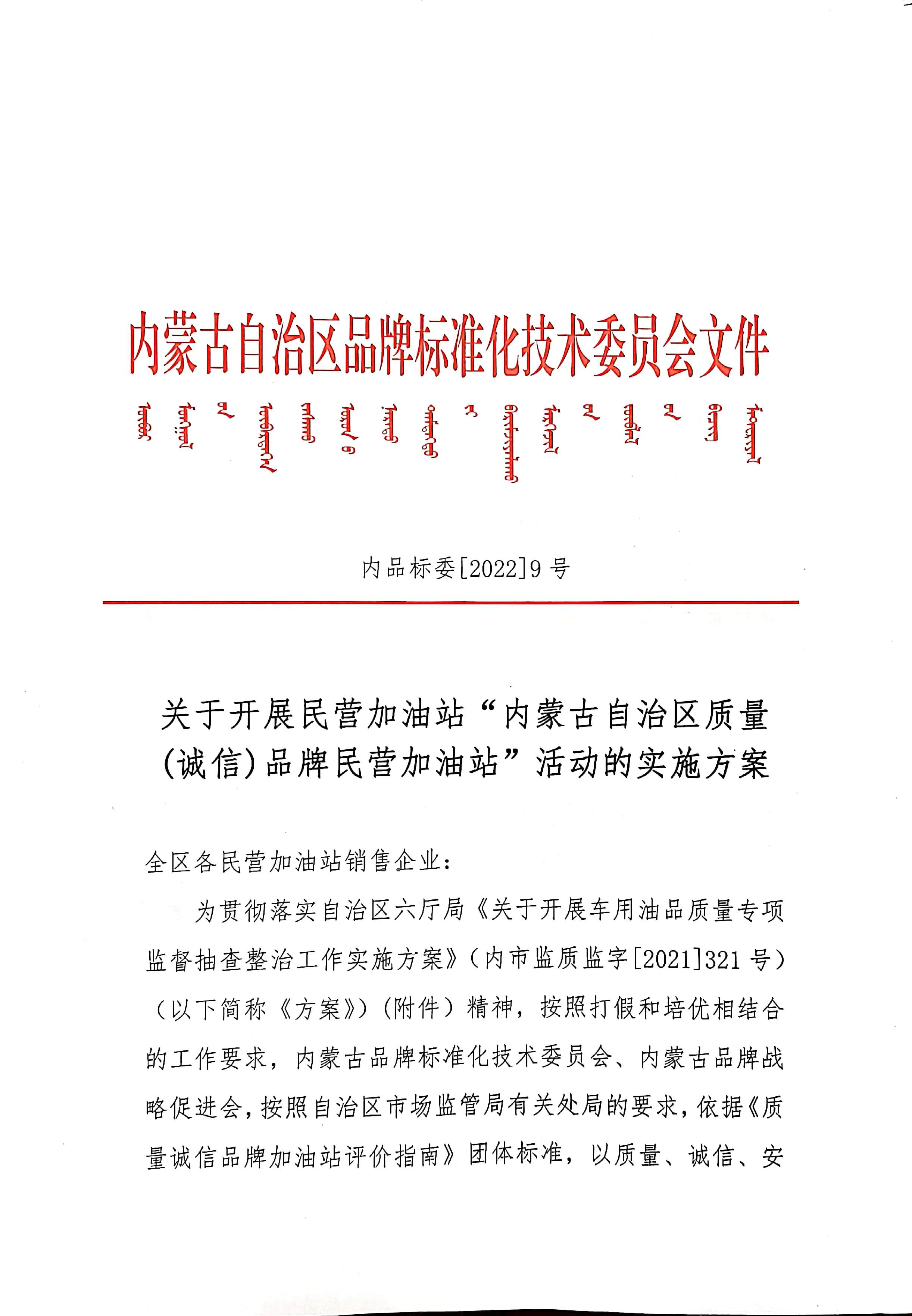 关于开展民营加油站“内蒙古自治区质量(诚信)品牌民营加油站”活动的实施