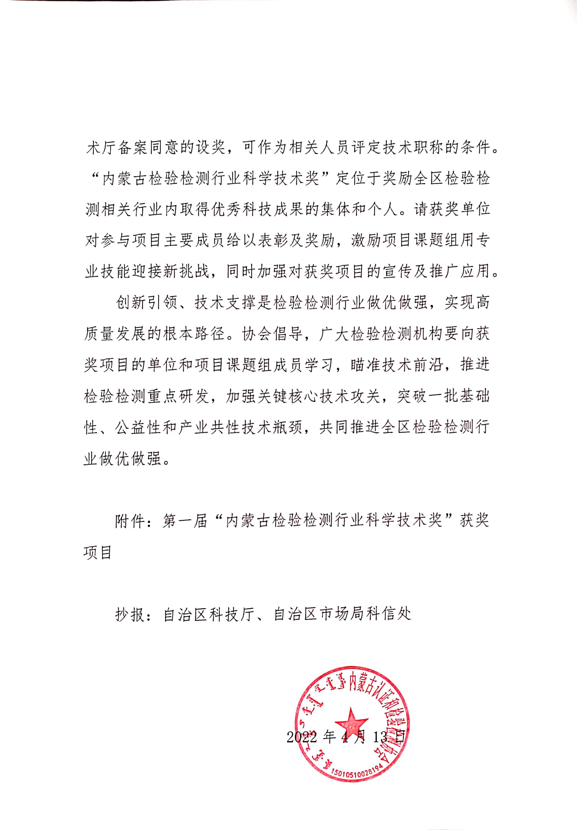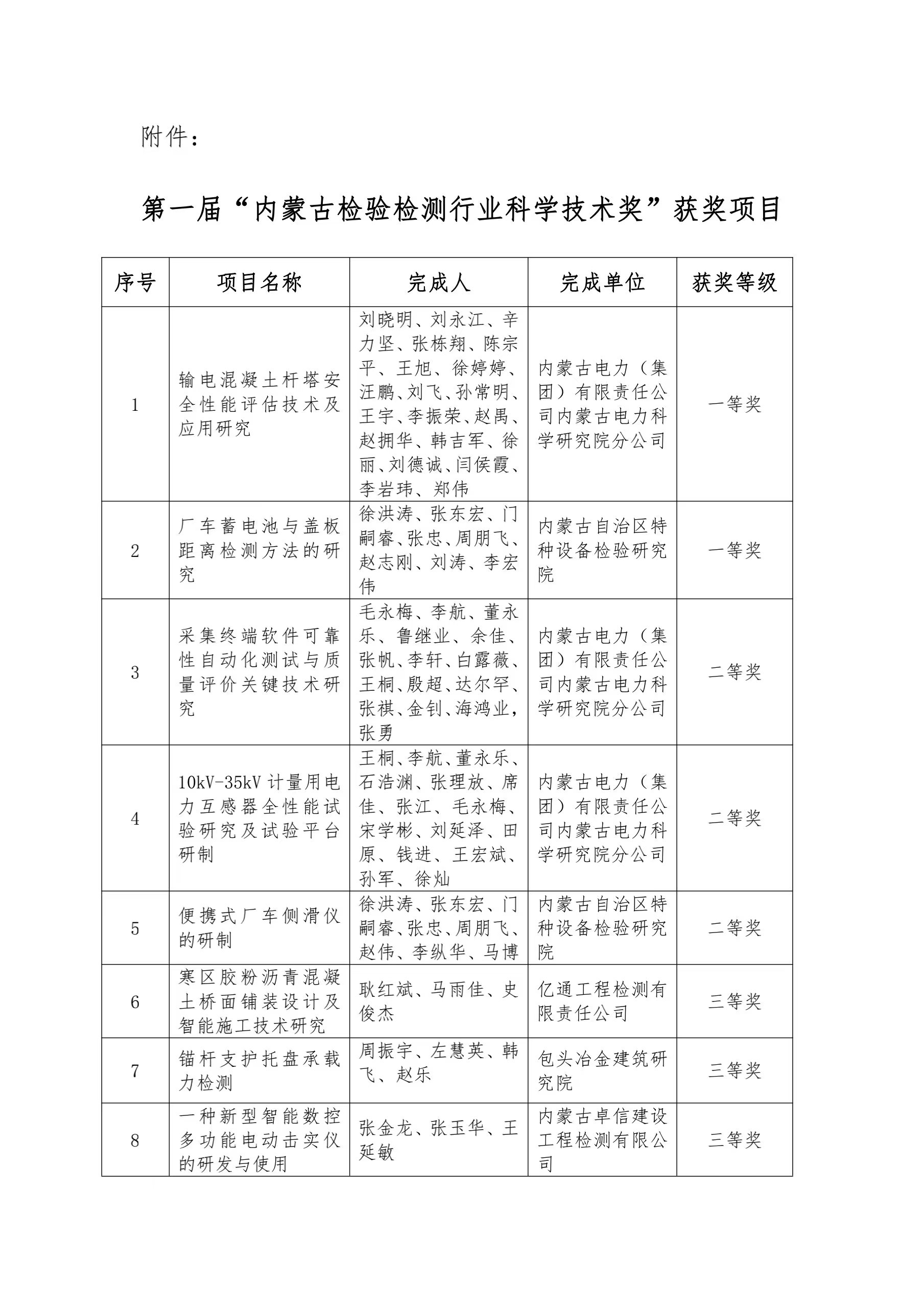 关于公布第一届“内蒙古检验检测行业科学技术奖”获奖项目的通知