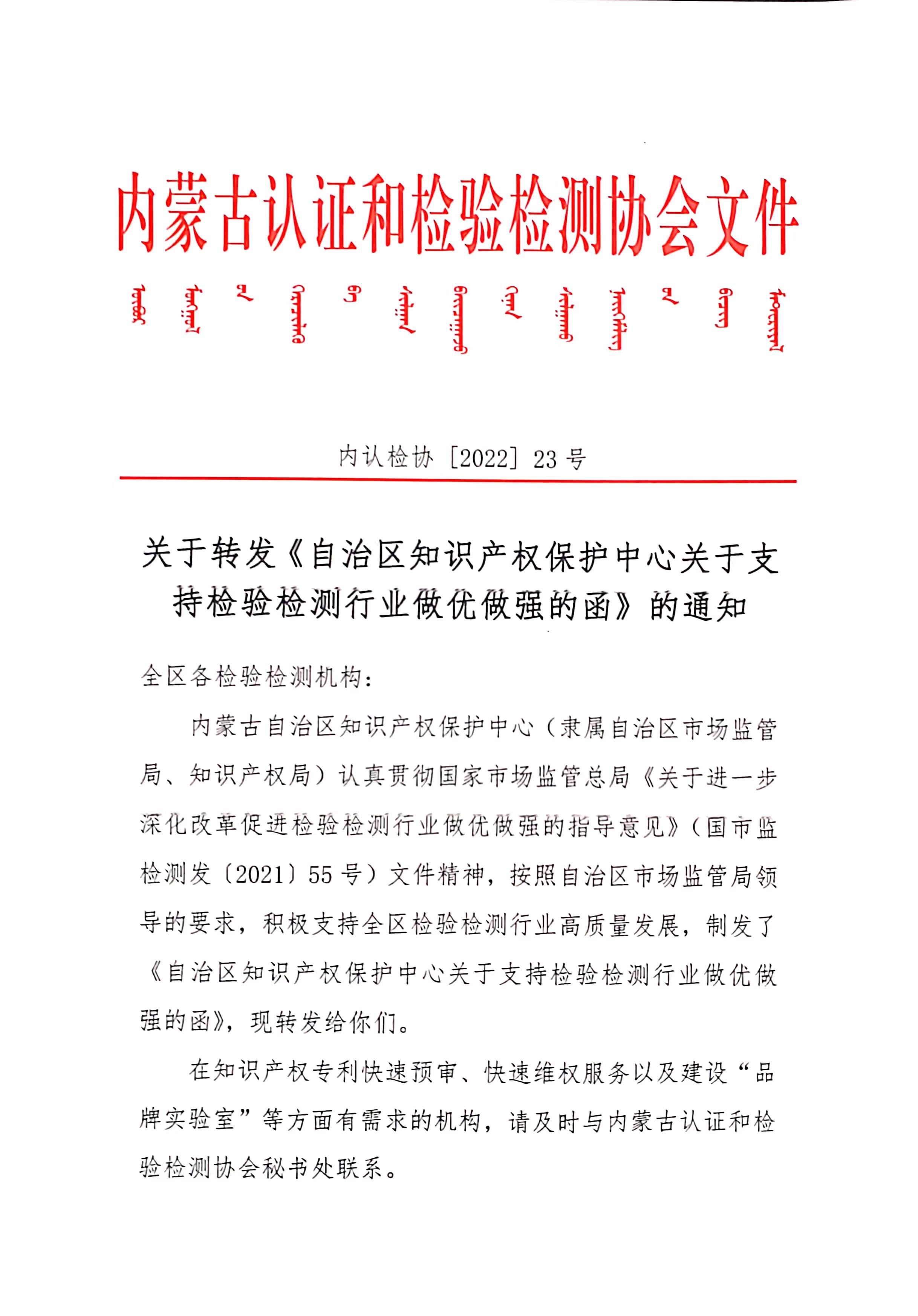 关于转发《自治区知识产权保护中心关于支持检验检测行业做优做强的函》的通