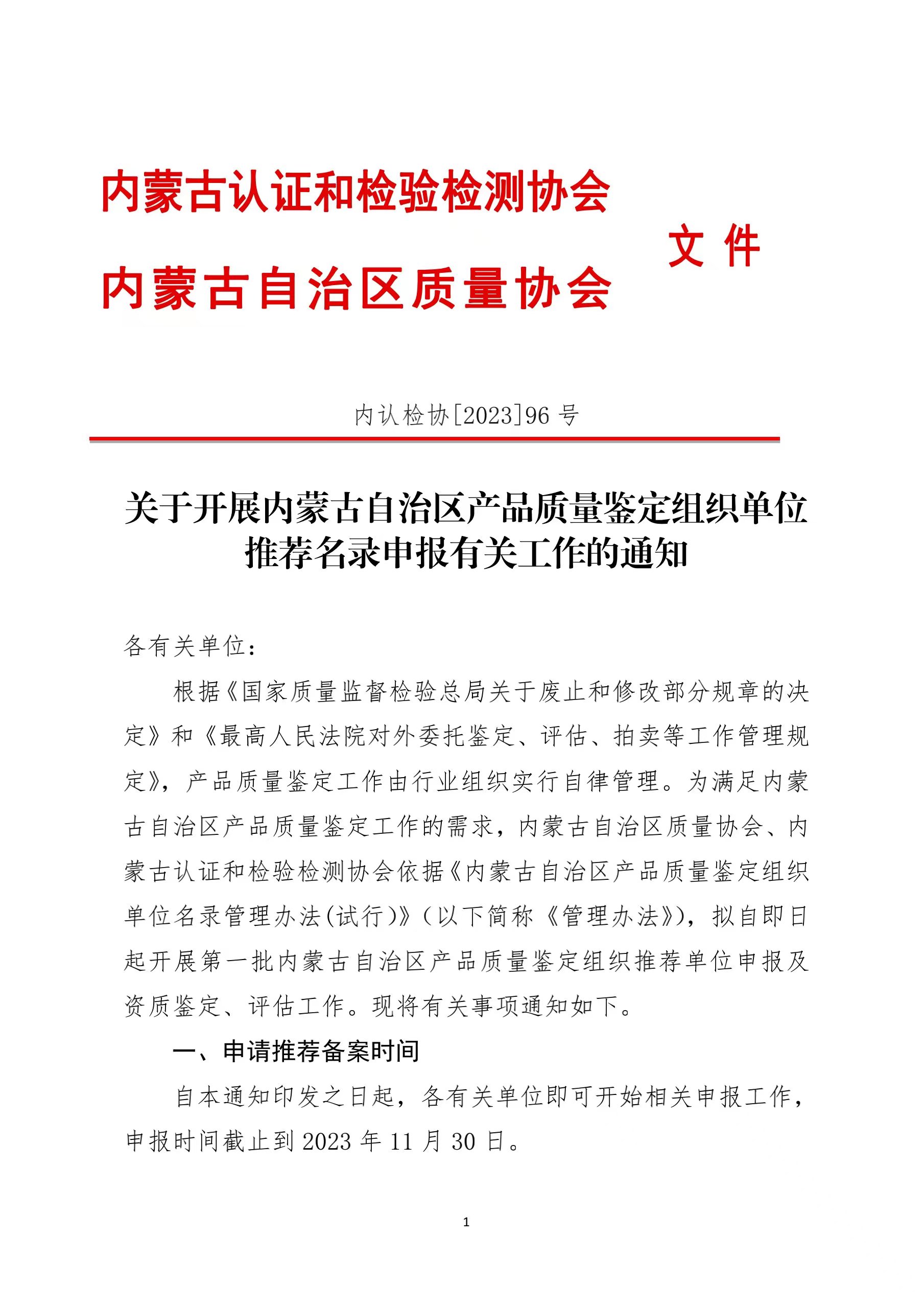 根据《国家质量监督检验总局关于废止和修改部分规章的决定》和《最高人民法院对外委托鉴定、评估、拍卖等工作管理规定》,产品质量鉴定工作由行业组织实行自律管理。为满足内蒙古自治区产品质量鉴定工作的需求,内蒙古自治区质量协会、内蒙古认证和检验检测协会依据《内蒙古自治区产品质量鉴定组织单位名录管理办法(试行)》(以下简称《管理办法》),拟自即日起开展第一批内蒙古自治区产品质量鉴定组织推荐单位申报及资质鉴定、评估工作。现将有关事项通知如下。