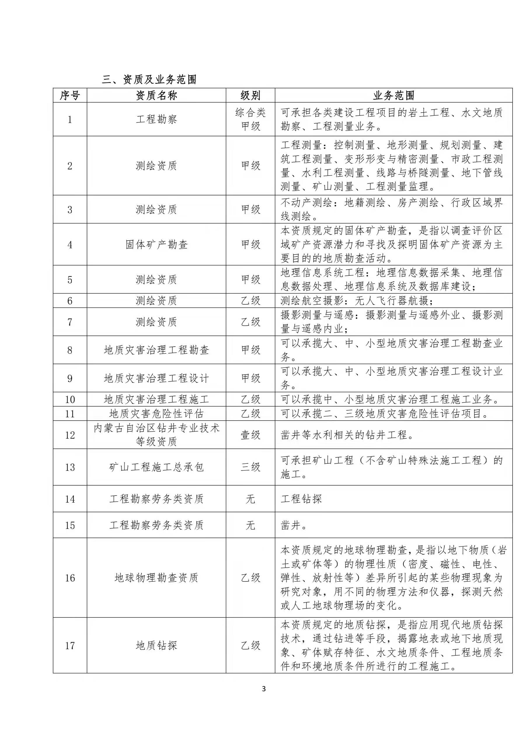 包钢勘察测绘研究院拥有工程勘察综合类甲级资质,测绘甲级资质,固体矿产勘查甲级资质、地质灾害工程勘查和设计甲级、施工和评估乙级资质、地基基础工程专业承包二级资质、钻井专业一级施工资质和矿山工程施工总承包三级资质等22项专业资质。目前我院现有职工310人,有注册土木工程师(岩土)7人,注册测绘师5人,一级注册结构工程师1人,一级注册建造师13人,二级注册建造师25人,注册造价工程师2人,注册安全工程师7人,有专业技术人员167人,有各类先进设备仪器700多台(套),2017年顺利通过了国家级高新技术企业认证,2020年完成国家级高新技术企业复评,是集科研、施工和技术服务于一体的综合类检验检测、工程勘察、矿产地质勘查、测绘、施工企业,以过硬的技术和诚信服务塑造了优良的品牌,始终坚持“以人为本、科技兴院、精细管理、服务创新”的核心价值观,本着“干好一项工程、树立一座丰碑、结交一方朋友”的经营理念,发扬“开拓、进取、求实、奉献”的钻头精神,竭诚为广大用户服务。